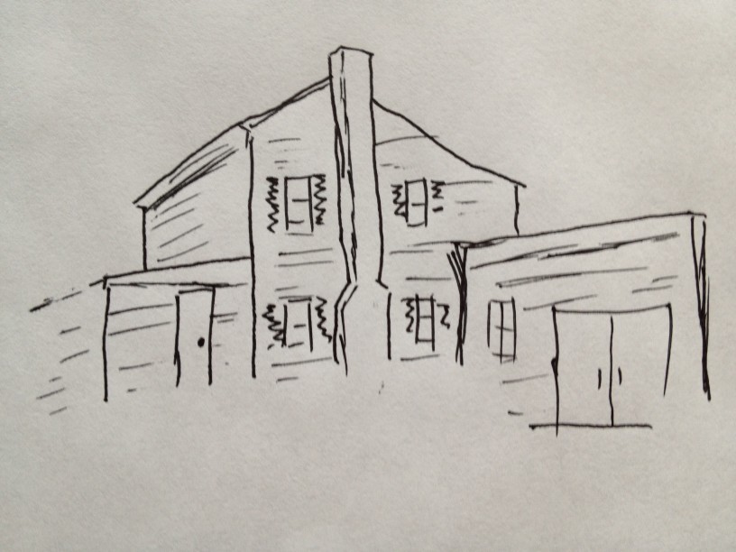 So Charles had a brainstorm (or so I thought), let’s do a pen and ink line drawing of the house. He said, “Let’s forget about the details and focus on the linear elements, just to capture its essence.” The idea sounded wonderful. But Honey, you failed in the execution of the plan. Perhaps you’ll get a new box of crayons for Father’s Day.