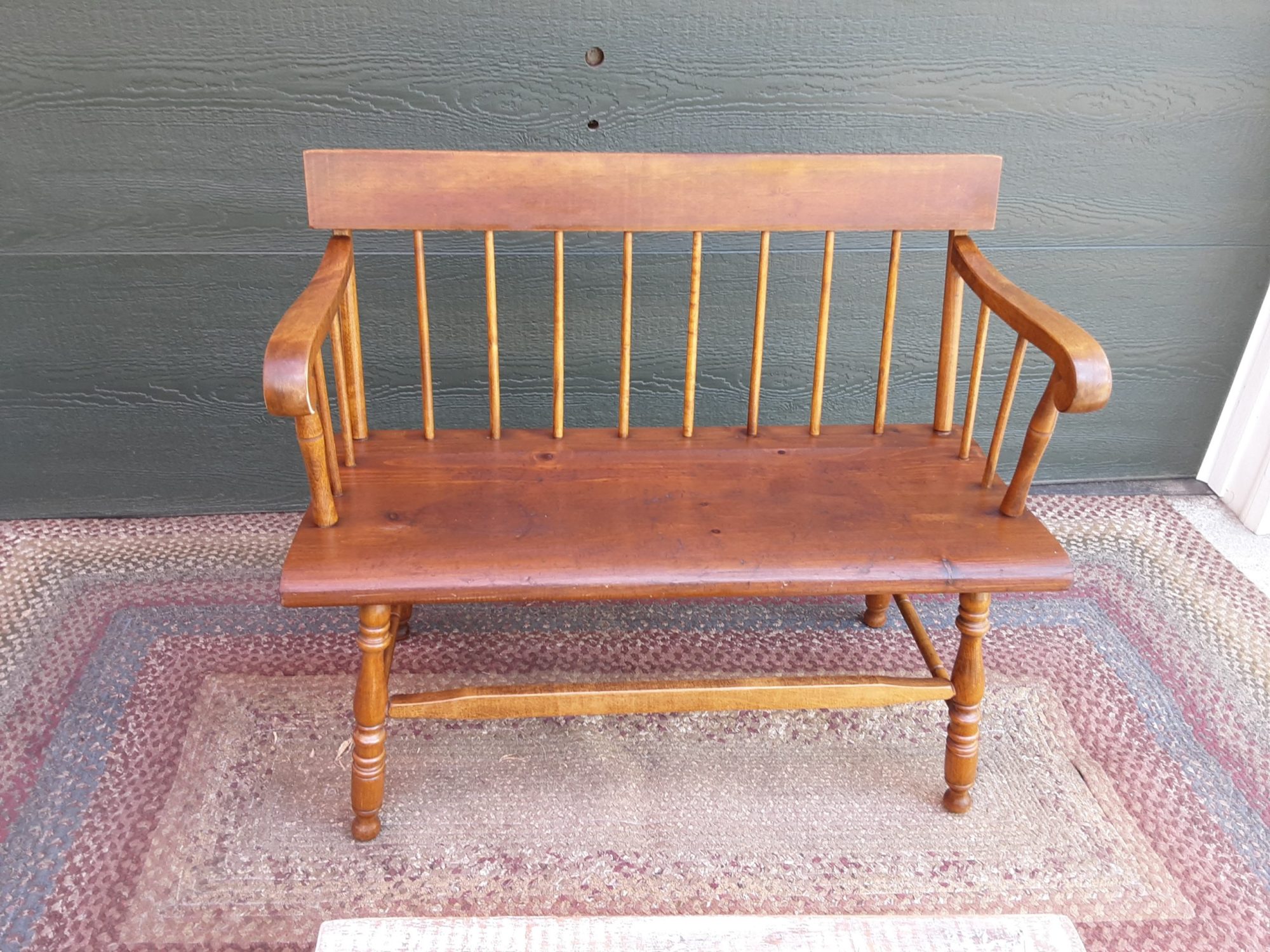 Sold – a pair of benches. First, a lovely old Deacons Bench. The arms and spindles are maple and the seat is pine, with a lovely aged patina.