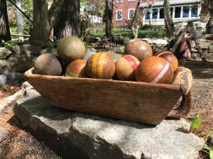 At Suzanne’s Cottage, we don’t do “shiny”. My color palette tends to be more subdued and earthy. Instead of brightly colored glass, or shiny metal, I have Croquet balls, Bocce balls, Billiard balls, Baseballs, and Softballs.